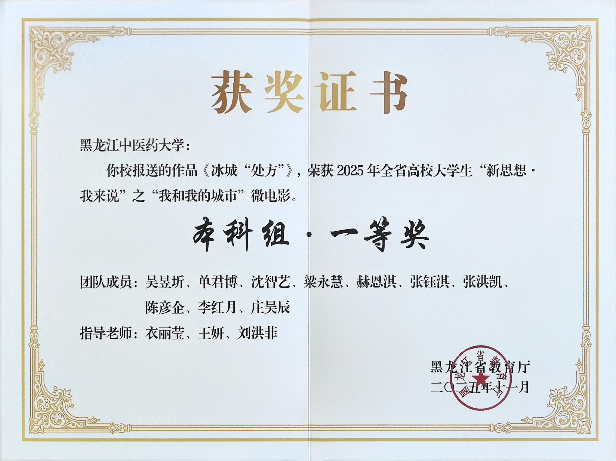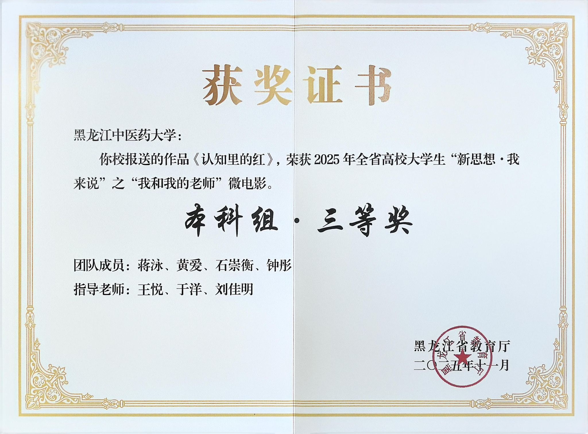 由我校马克思主义学院选送,思政课教师孙相娜、于潇、林晓刚指导完成的作品《“五味”匠心》,荣获2025年全省高校大学生“新思想·我来说”之 “我和我的时代”微电影本科组一等奖;思政课教师衣丽莹、王妍、刘洪菲指导完成的作品《冰城“处方”》,荣获 2025年全省高校大学生“新思想·我来说”之“我和我的城市”微电影本科组一等奖;思政课教师任永健、宋佳玉、刘佩文指导完成的作品《味甘如露》,荣获2025年全省高校大学生“新思想·我来说”之“我和我的老师”微电影本科组一等奖。由我校佳木斯学院选送,思政课教师王悦、于洋、刘佳明指导完成的作品《认知里的红》,荣获2025年全省高校大学生“新思想·我来说”之“我和我的老师”微电影本科组三等奖。