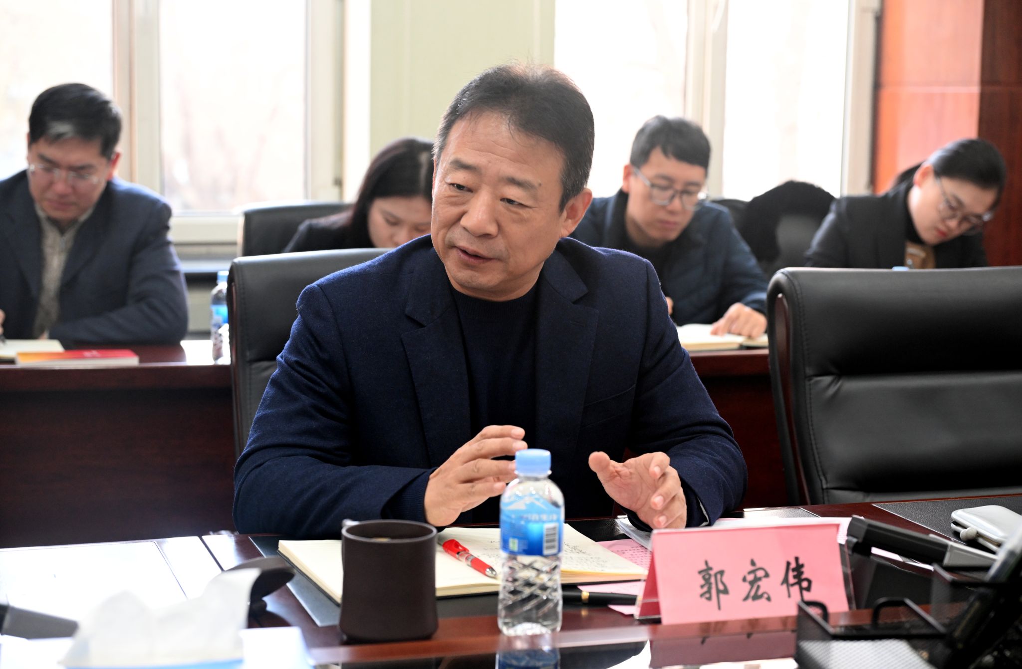 为深入学习贯彻党的二十届四中全会精神,坚持思政课建设与党的创新理论武装同步推进,推动全会精神进教材进课堂进头脑,11月14日下午,马克思主义学院在主楼206会议室举行“党的二十届四中全会精神融入思政课教学”集体备课会,学校专、兼职思政课教师参会。学校党委书记赵炜明、校长郭宏伟、党委副书记尹占军参加集体备课。